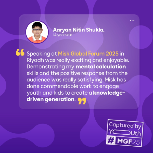 At #MGF25, Aaryan Nitin Shukla shared his mission to inspire youth through mental calculation and praised Misk’s role in building a knowledge-driven generation aligned with Vision 2030.