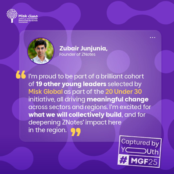 Zubair Junjunia, founder of ZNotes and part of Misk’s 20 Under 30 in Technology and Innovation, shares what being selected means for his journey and the work he’s building in the region.